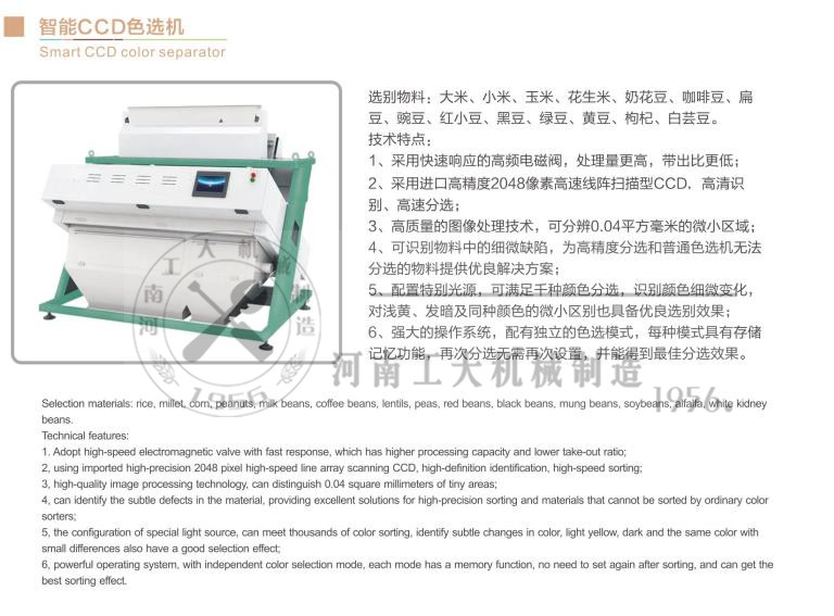 选别物料:大米、小米、玉米、花生米、奶花豆、咖啡豆、扁豆、豌豆、红小豆、黑豆、绿豆、黄豆、枸杞、白芸豆。