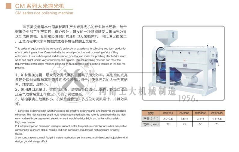 该系类设备是本公司集长期生产大米抛光机的专业技术经验,结合碾米企业加工生产实际,精心设计、研发的一种既能够使大米抛光效果达到洁白光亮,又非常经济耐用的适用型大米抛光机,可以满足碾米工厂工艺流程中大米单机抛光或者多机轻抛的工艺要求。