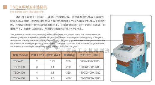 本机是玉米加工厂和酒厂、酒精厂的理想设备。本设备利用胚芽与玉米碴的比重和悬浮速度不同的物料借助向上穿过胚芽间隙的气流作用促使胚芽与玉米碴分级,在做定向倾斜往复回转的筛板作用下,向排碴端运动,浮于上层的玉米碴在自重作用下,向出料口端流动,从而把玉米碴从胚芽中分离出来。
