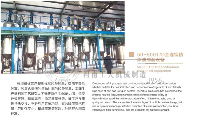 连续精炼采用新型连续脱酸脱臭,适用于酸价较高,胶质含量低的植物油脂的脱酸脱臭,实际生产证明该工艺具有以下显著特点:脱酸能力强,热脱色效果好,精炼率高,油品质量好等。该工艺多重进行热交换,充分利用系统功能,有效降低蒸汽耗量,劳动强度小,精炼率高等,油脂符合国家标准。
