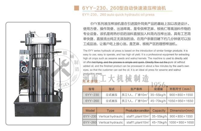 液压榨油机是在引进国外同类产品的基础上加以改进设计。使用方便、操作简便、出油率高,是榨芝麻、核桃仁等高油料作物的专业设备,该机是将热炒后的油料直接加入料简内压榨出油,具有工艺简单快捷、直接流出油,在用户亲眼目睹下约几分钟就可以加工成品油,让客户吃上放心油。是芝麻、核桃产区的理想榨油机。